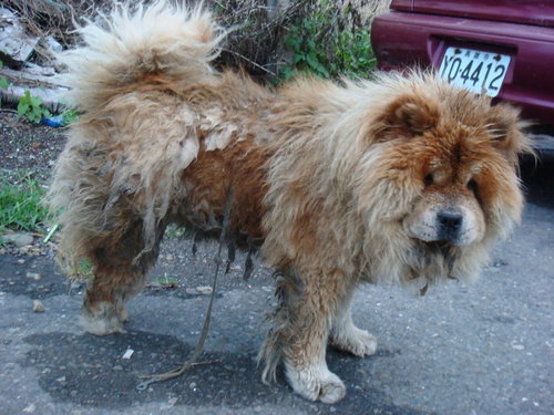 昨晚的一場雨.鬆獅犬更髒了.....身上還有一條很爛又細的牽繩.拜託牠是大型犬竟用如此細繩