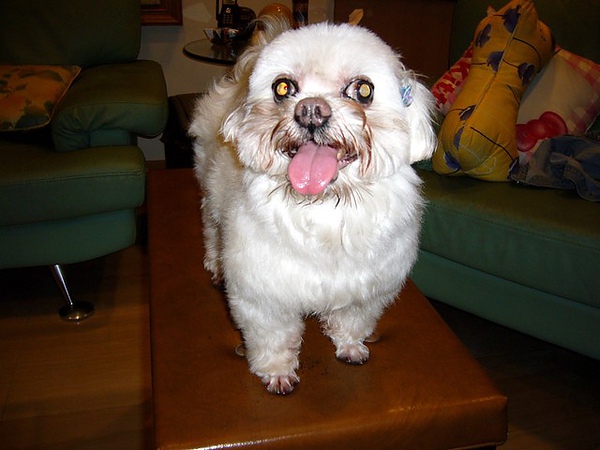眼睛和鼻子三個黑點點剛好呈正三角形.鼻子上有一顆黑痣.有白內障眼睛白白的.右後腳有傷有時會一跛一跛的.