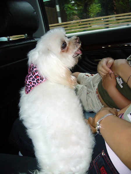 戴米色防蟲項圈.耳朵綁天藍色髮飾 粉紅色豹紋領巾 他剛剪毛,體毛約一公分長